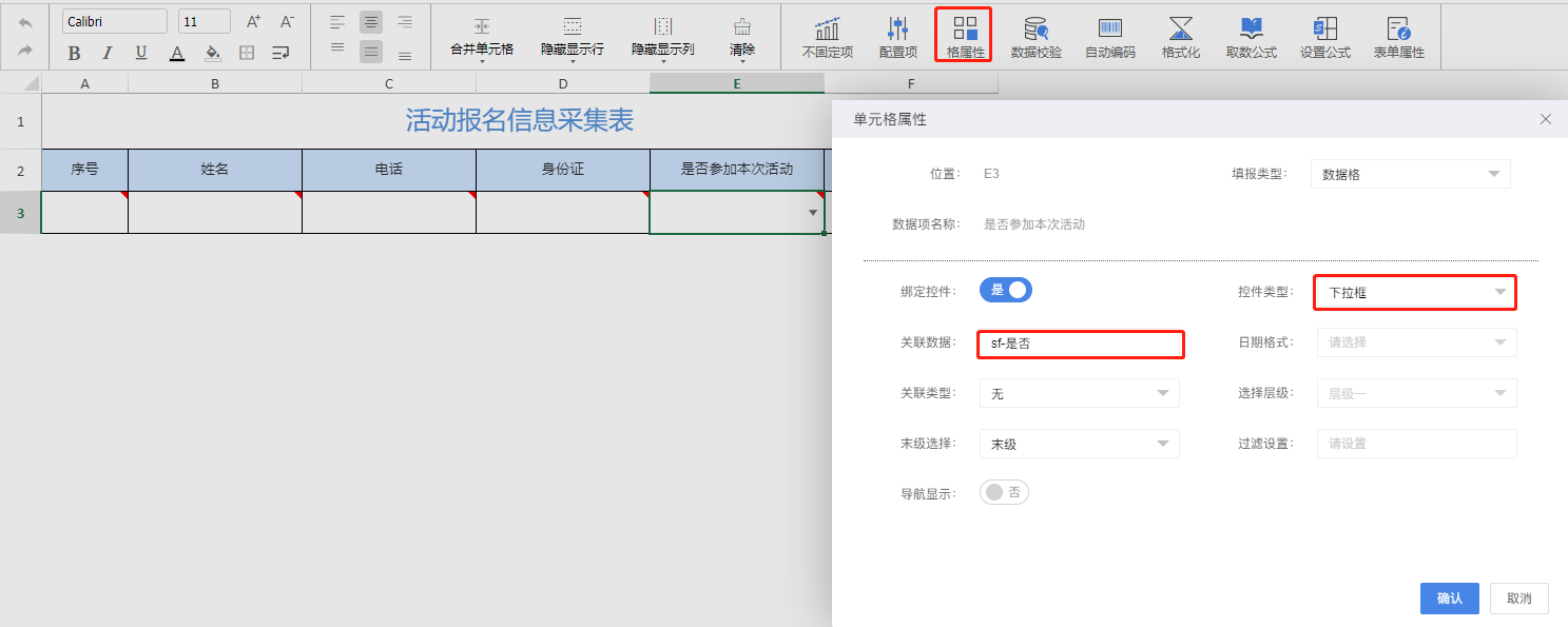 2)配置下拉框:选中“是否参加本次活动”的数据项单元格,打开格属性,绑定控件,控件类型选择下拉框,关联数据选择对应的【基础档案】,关联类型默认是无,末级选择默认是末级,“备注”的数据项单元格以同样的方式进行设置;