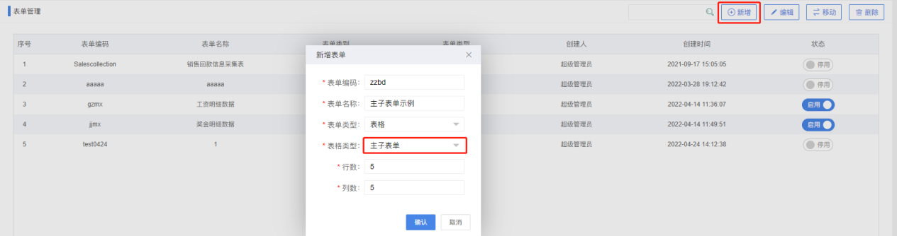 进入表单管理,点击右上键的新建,出现新增表单的弹窗,根据需求依次填写弹窗内容;