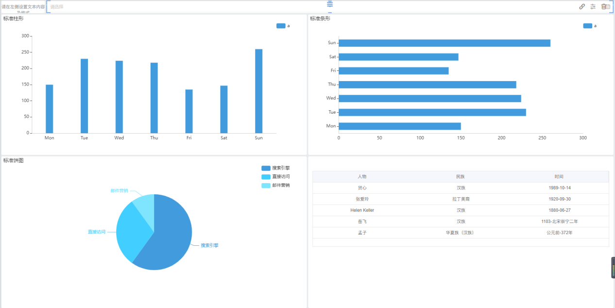 我们即将要构建的驾驶舱样式,包含一个标准柱图、标准条形图、标准饼图、表格、文本和日历控件,下面我们依次将图形组件和可视化控件拖拽到设计区并调整一下大小如下所示;