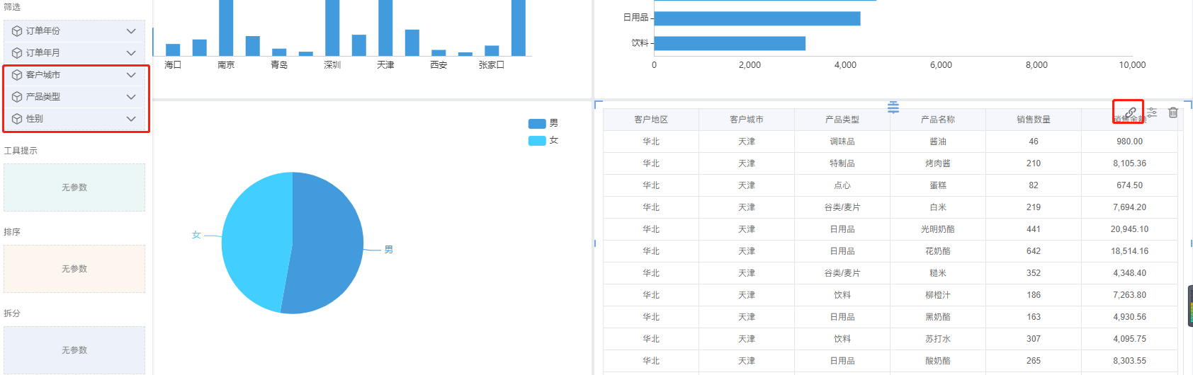 打开表格的数据绑定按钮,将维度“客户城市”、“产品类型”和“性别”拖入到筛选区如下所示: